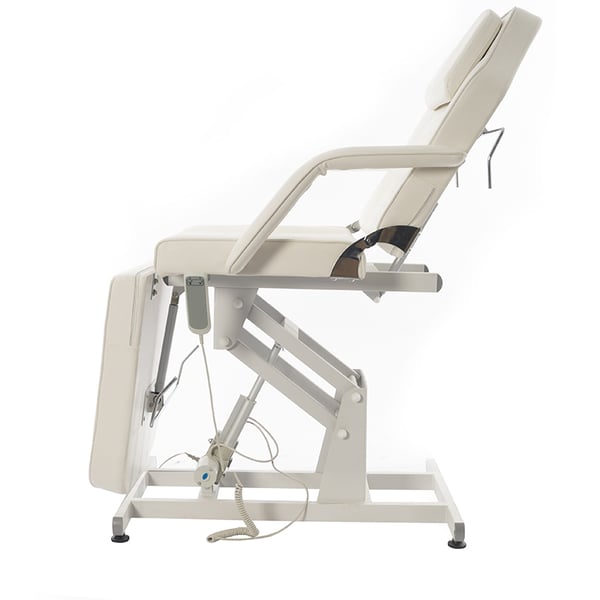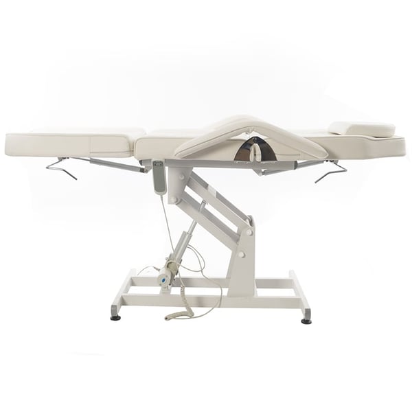 Sillón camilla de estética Bucci: Eléctrico con tres cuerpos y regulación en altura, reposabrazos extraíbles y agujero facial