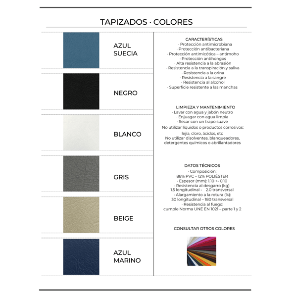 - Tapizada y acolchada en polipiel sintético de color a elegir, ignífugo, con interior de gomaespuma esponjosa de alta densidad.