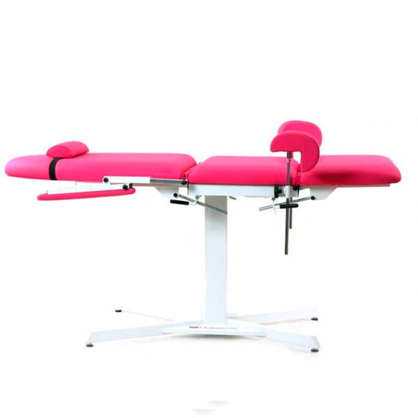 Sillón de ginecología de altura fija: tres cuerpos, con perneras, bandeja extraíble, apoyabrazos y cojín cervical