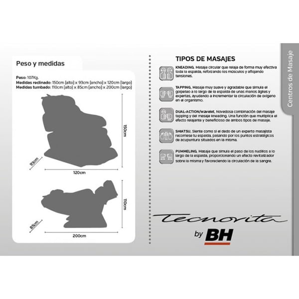 - Masaje kneading: Masaje circular que relaja de forma muy efectiva toda la espalda, reforzando los músculos y aflojando tensiones.