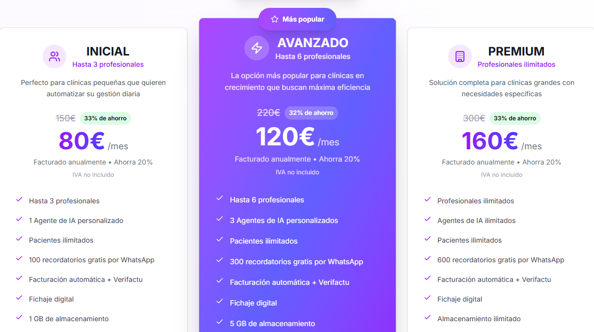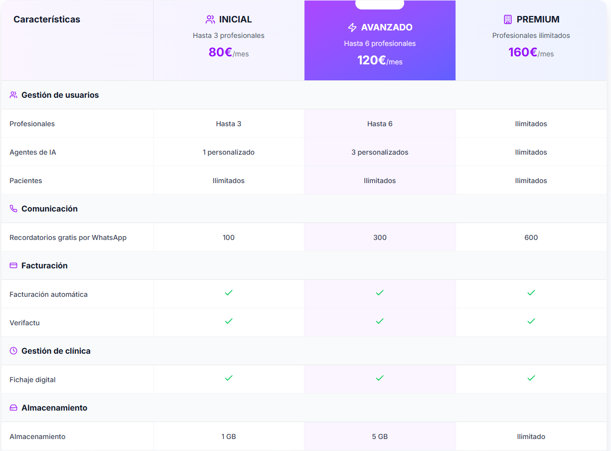 Ideal para clínicas pequeñas (hasta 3 profesionales) que quieren digitalizar su gestión y empezar a usar IA en tareas básicas.